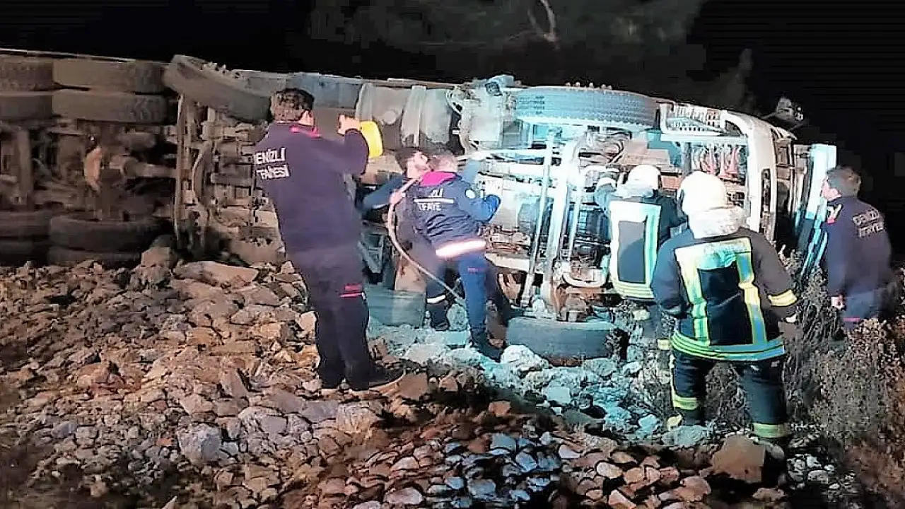 Denizli'nin Kale ilçesinde kontrolden çıkan tomruk yüklü kamyon şarampole devrildi. Kazada hayatını kaybeden sürücünün cansız bedeni, itfaiye ekipleri tarafından sıkıştığı yerden çıkarıldı.