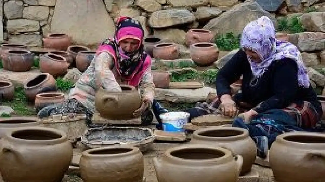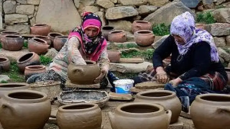 Gümüşhane'nin merkeze bağlı Dölek köyünde üç ayrı dağdan eşek sırtında getirilen topraklar, köylü kadınların elinde güveç, testi, vazo, sürahi gibi ürünlere dönüşüyor.