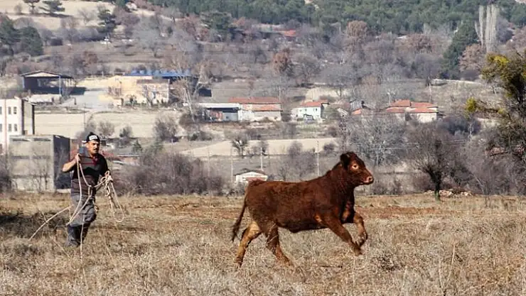 Kütahya'nın Domaniç ilçesinde düzenlenen büyükbaş hayvan dağıtımtöreninden kaçan boğa, yaklaşık 4 saat süren kovalamacanın ardından sahibine teslim edilebildi.