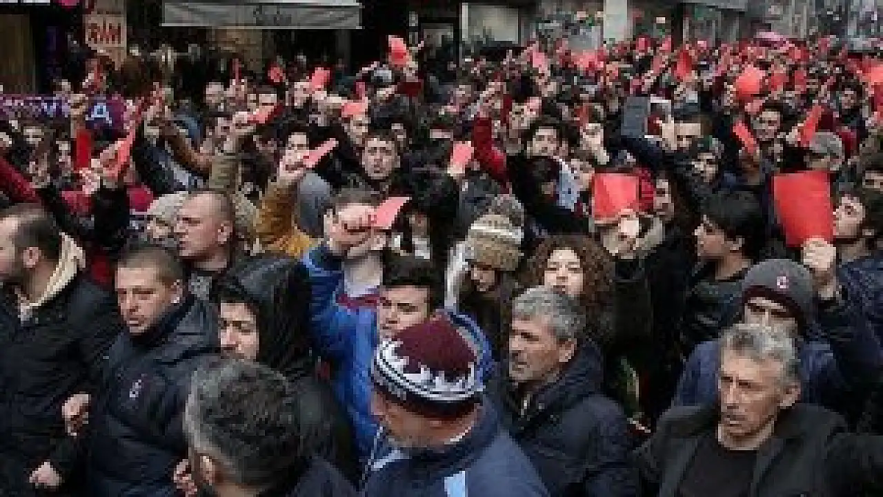 Trabzon Atatürk Alanı'nda toplanan bir grupTrabzonsporlu taraftar, ellerindeki kırmızı kartlarla Uzun Sokak'ta yürüyüş yaptı.