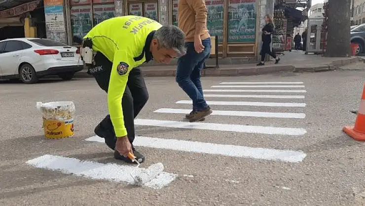 İslahiye'de trafik polisleri, kendi görev yaptığı bölgelerde rengi solmuş yada silinmiş yaya geçidi çizgilerini kendi elleriyle yeniden çizdi.