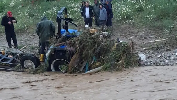 Hızla akan çaydan traktör metrelerce sürüklendi. Bir süre sonra duran traktör, yağmurun etkisini yitirmesiyle çaydan çıkarıldı.