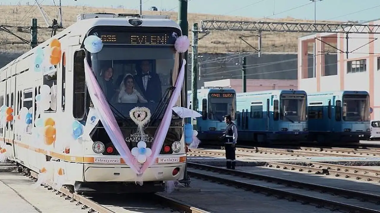 Gaziantep Büyükşehir Belediyesinde görevli vatman çiftin nikahı rayların üzerinde kıyıldı.