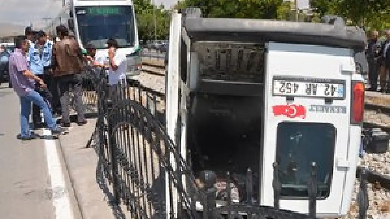 Konya'da meydana gelen trafik kazasında hafif ticari araç tramvay yoluna girerek takla attı.