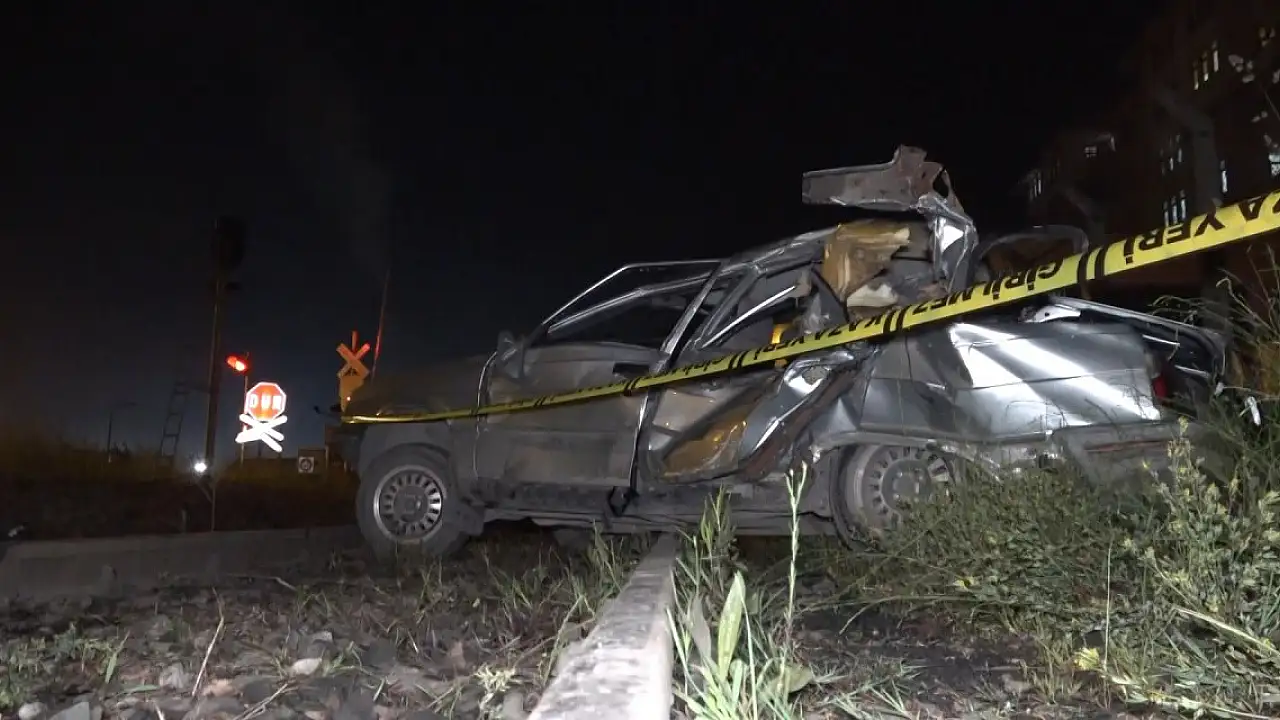 Trenin çarptığı otomobilin sürücüsü şans eseri yaralanmadı