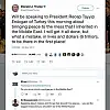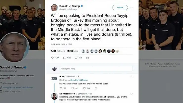 "Pour résoudre le désordre au Moyen-Orient, dont j'ai hérité, je vais m'entretenir au téléphone, ce matin (heure locale), avec le président Recep Tayyip Erdogan. Je vais résoudre cette situation mais perdre des vies et des dollars (6 trillions) au début c'était une erreur" a t-il écrit.