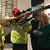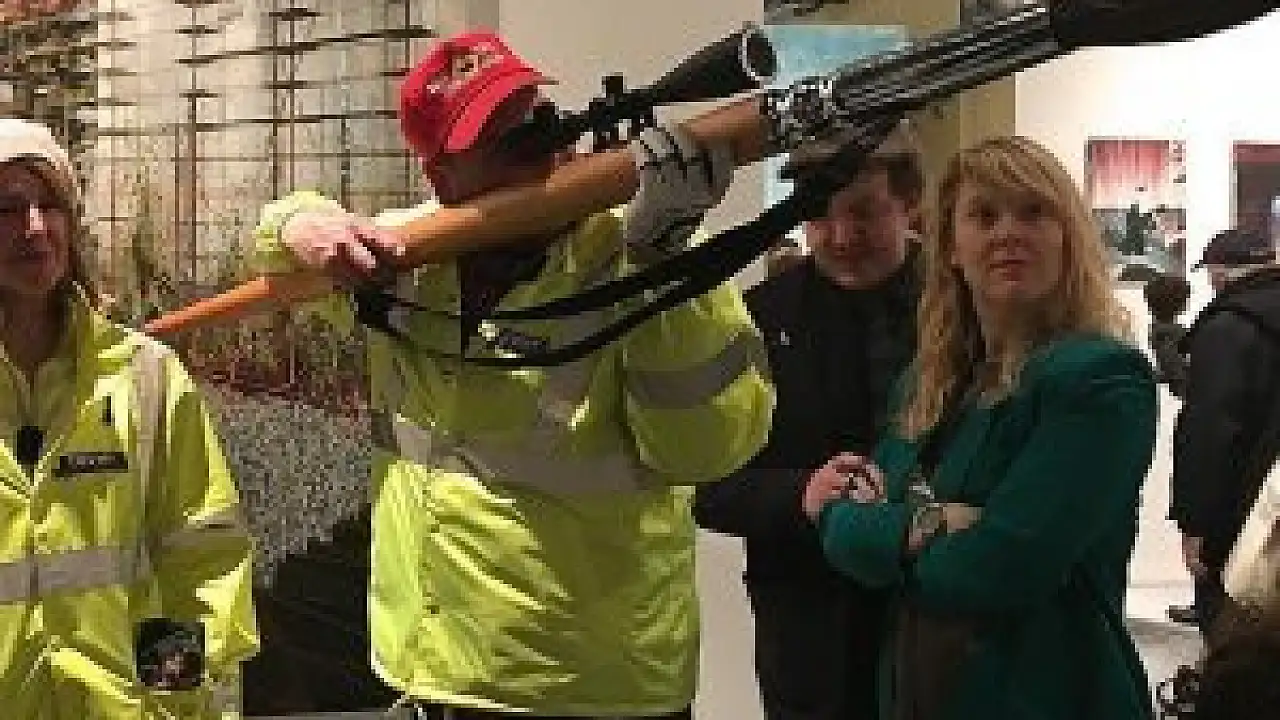 Yüzlerine maske takıp, büyük bir resim fırçasıyla dürbünlü silahı birleştiren ikili, yaptıkları bu sembolik silahı gittikleri her yere götürüyor. Sanatçılar, silahların serbestçe taşınmasına tepki gösteriyor.