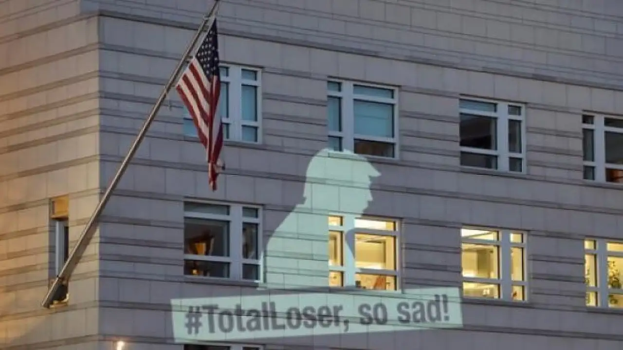 ABD’nin Berlin Büyükelçiliği önünde dün gece toplanan Greenpeace üyeleri Donald Trump'ın Paris İklim Anlaşması'ndan çekilme kararını protesto etti. Greenpeace aktivistleri, büyükelçilik binasının duvarına projeksiyonla "Tam bir ezik, çok acınası!" (Total Loser, so sad!) yazısını yansıttı.