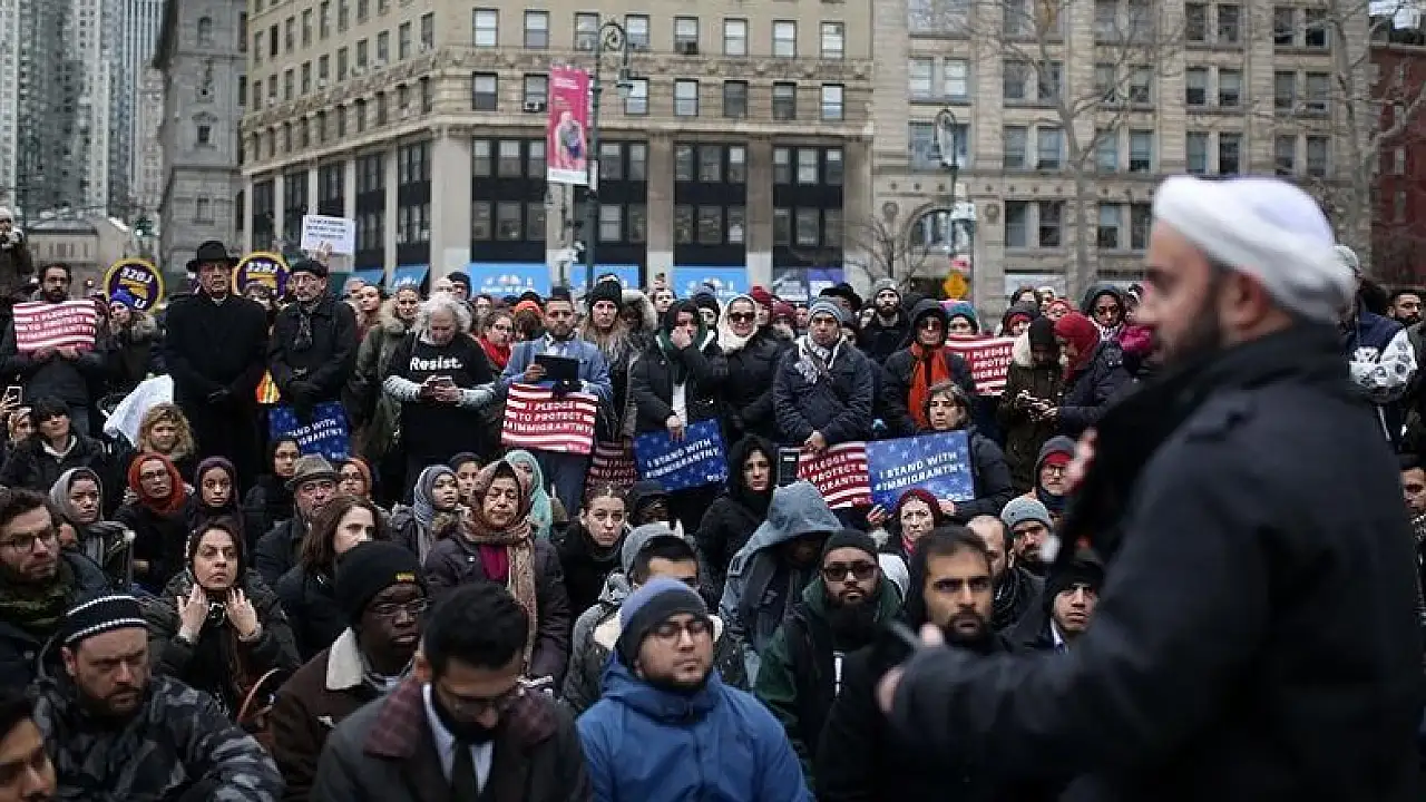 Farklı dinlere mensup temsilciler, New York Göçmen Koalisyonunun öncülüğünde Trump'ın göçmen ve Müslüman karşıtı politikalarını protesto etmek amacıyla Foley Meydanı'nda bir araya geldi.