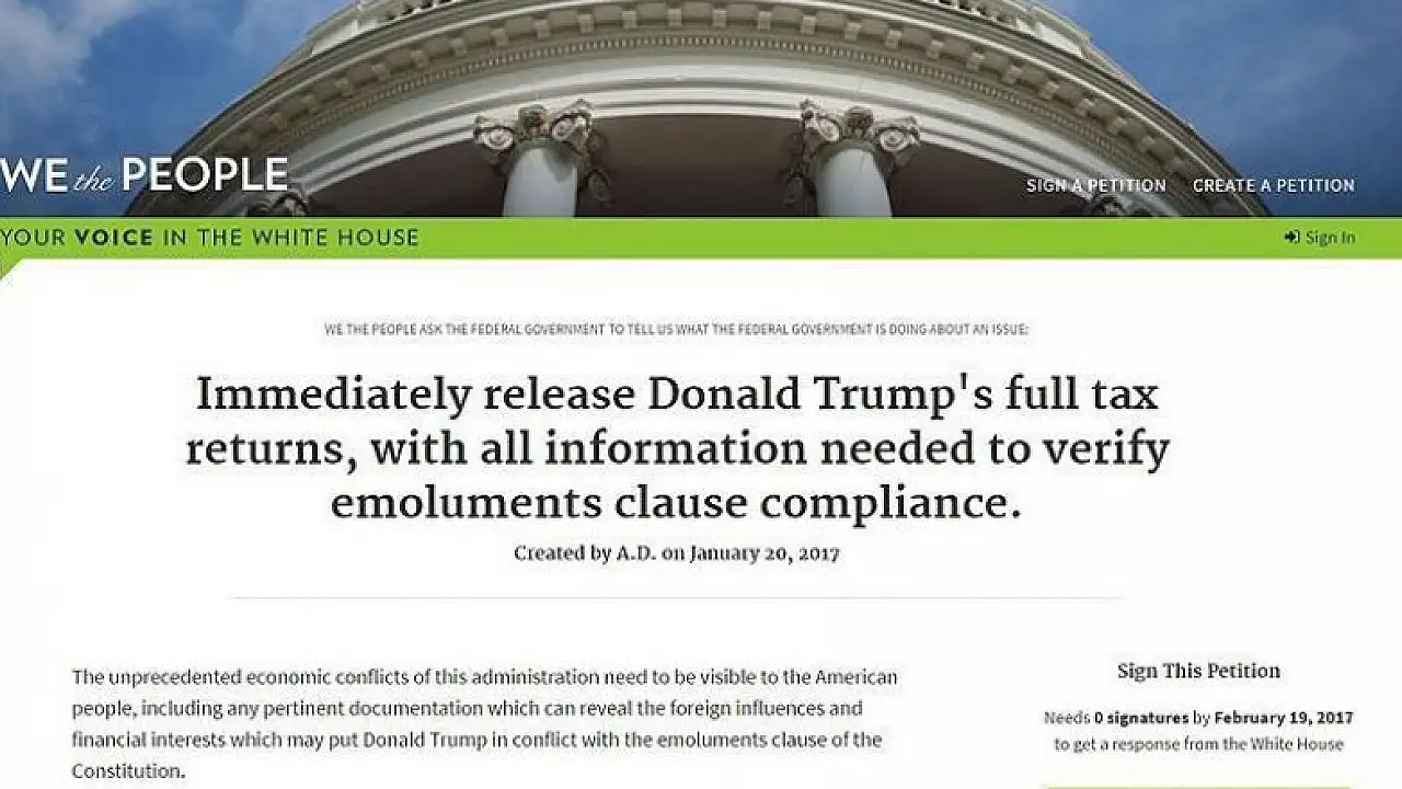 Dün Kongrede ettiği yeminle ABD'nin 45. Başkanı olan Trump'ın vergi iadeleriyle ilgili açılan online dilekçeye bir gün içinde atılan imza sayısı 130 bini geçti. Söz konusu dilekçede "Donald Trump'ın tüm vergi iadelerini en kısa zamanda açıklaması gerektiği" ifade ediliyor.