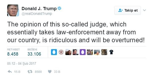 ABD'nin yeni başkanı Donald Trump, "Bu sözde yargıcın kanaati kanun uygulama yetkisini ülkemizin elinden alıyor. Bu çok saçma. Kararı geri çevireceğiz" dedi.