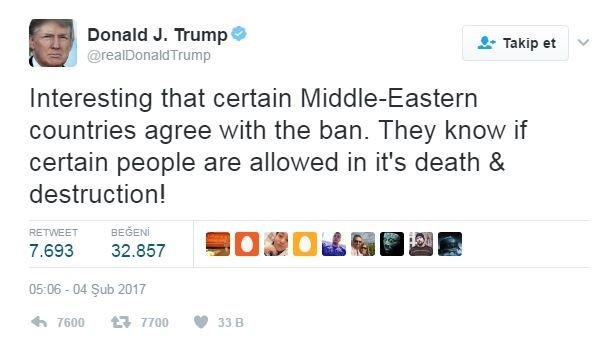 Öte yandan Suudi Arabistan ve Birleşik Arap Emirlikleri'nin giriş yasağına destek vermesini değerlendiren Trump, şöyle konuştu: "Bazı Ortadoğu ülkelerinin yasağa destek vermeleri ilginç. Biliyorlar ki bazı kişiler girerse kaos ve yıkım olacaktır."