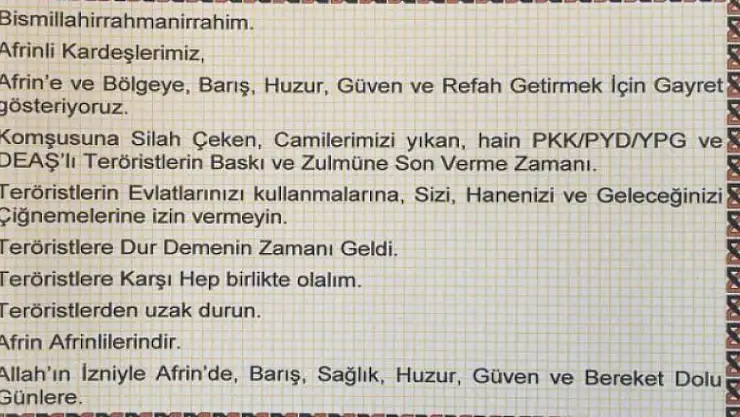 "Komşusuna silah çeken, camilerimizi yıkan, hain PKK/PYD/YPG ve DEAŞ'lı teröristlerin baskı ve zulmüne son verme zamanı. Teröristlerin evlatlarınızı kullanmalarına, sizi, hanenizi ve geleceğinizi çiğnemelerine izin vermeyin. Teröristlere 'dur' demenin zamanı geldi. Teröristlere karşı hep birlikte olalım. Teröristlerden uzak durun. Afrin, Afrinlilerindir. Allah'ın izniyle, Afrin'de barış, sağlık, huzur, güven ve bereket dolu günlere."