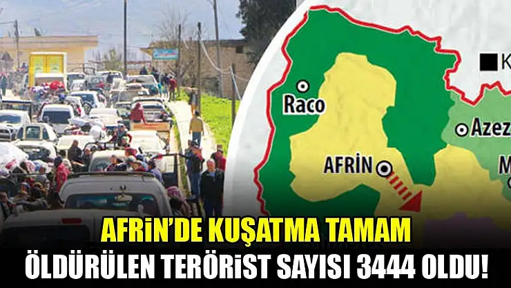 Zeytin Dalı Harekâtı'nda Mehmetçik ve ÖSO güçleri tarafından Afrin ilçe merkezinin kuşatması tamamlandı. TSK'dan yapılan açıklamaya göre 3444 terörist öldürüldü.