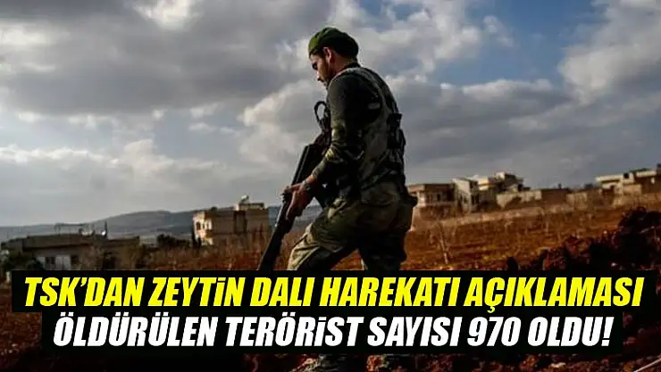 TSK'dan gelen son dakika açıklamasında Afrin harekatında etkisiz hale getirilen terörist sayısının 970'e yükseldiği duyuruldu.