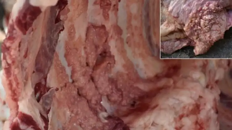 Elbistanhöyüğü Mahallesinde Adem Eroğlu ile 5 arkadaşı tarafından üç ay önce alınan büyükbaş hayvan, kesildikten sonra kaburgayı ve akciğeri sarmış kabarcıklar fark edildi.