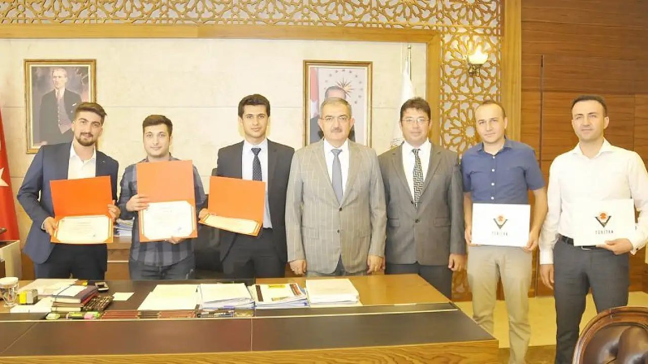 Selçuk Üniversitesi Teknoloji Fakültesi Bilgisayar Mühendisliği Bölümü TÜBİTAK bölge birincisi öğrencilerini Rektör Şahin, makamında kabul etti.