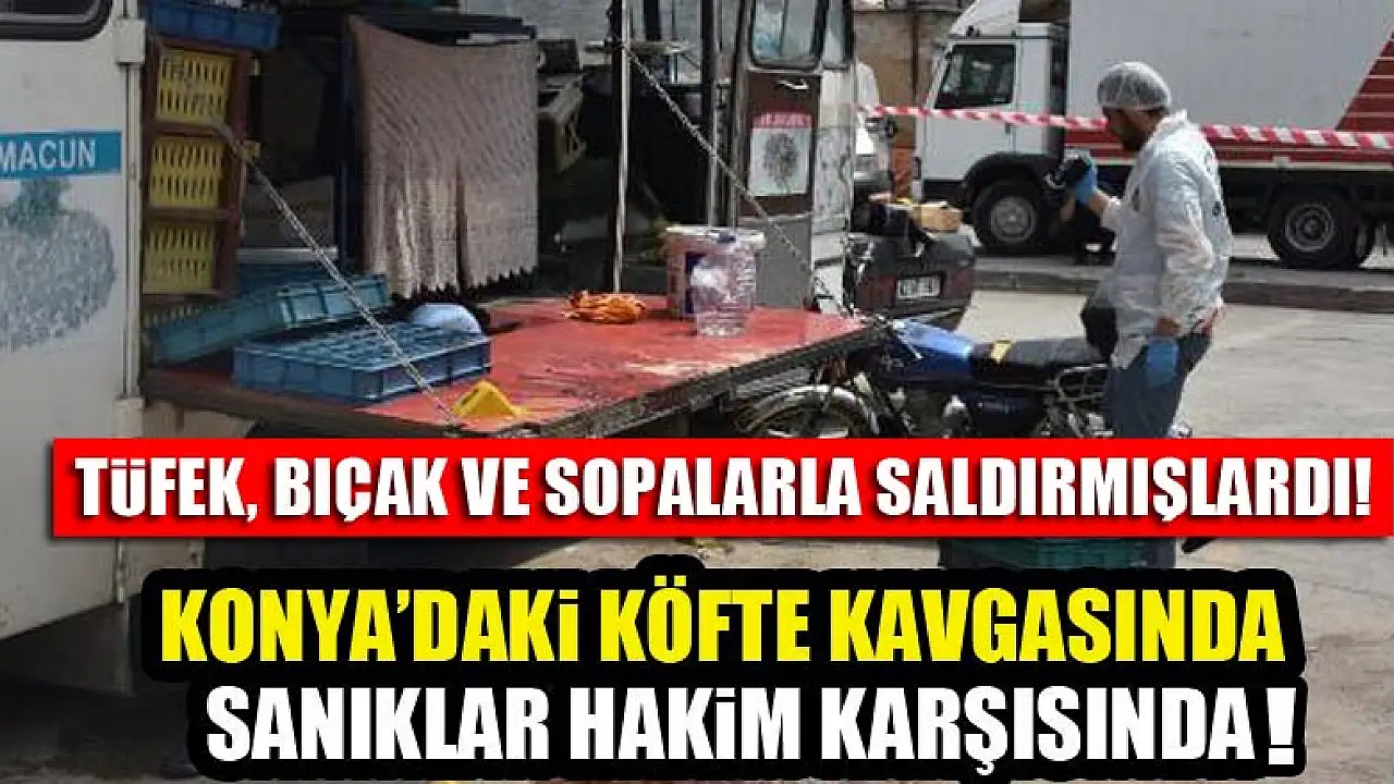 KONYA'da geçen yıl pazar yerinde çıkan tüfek, bıçak ve sopaların kullanılıp 11 kişinin yaralandığı kavgada, 3'ü tutuklu 14 sanığın Konya 1'inci Ağır Ceza Mahkemesi'nde 'yaralama' suçundan yargılanmalarına başlandı. Kavganın, tutuklu sanıklar Muammer Dönmezer (31) ve amcası Hakan Dönmezer'in (36), daha önce yedikleri köftenin parasını vermedikleri için seyyar köfteci Mehmet Ali Durgut'un (31) köfte vermemesi üzerine çıktığı ileri sürüldü.