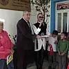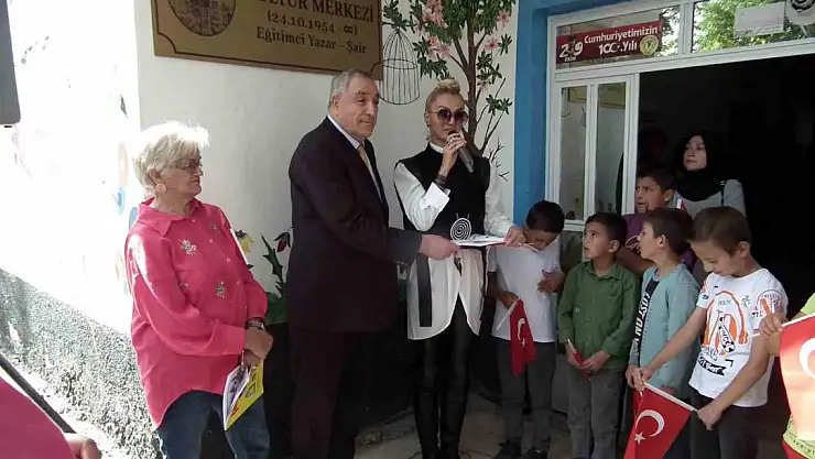 Kütüphanenin açılışının ardından çocuklarla birlikte masada babasının kitaplarını inceleyen Tuğba Özay, çocuklara kitaptan şiirler okuttu. Şiir okuyan çocuklara babasının kitaplarından armağan etti.
