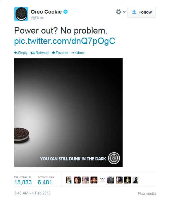 Dünyanın en çok ödül alan bir Real Marketing örneğiyle bu haftamızı da kapatalım. Amerika’nın en büyük spor organizasyonu sırasında Oreo için mükemmel bir gerçek zamanlı pazarlama örneği uygulanmış. Organizasyonun ortasında elektrik kesintisini fırsat bilen reklam ajansı hemen anlık reaksiyonu göstermiş; “Ağzının yolunu karanlıkta bulabilirsin herhalde?”.