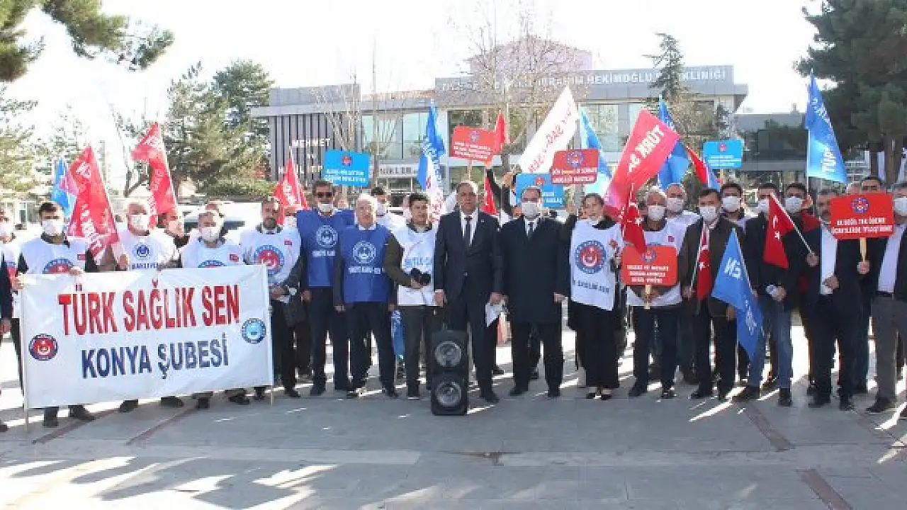 Meram Devlet Hastanesi önünde sağlıkçılar bir günlük iş bırakma eylemi yaptı.