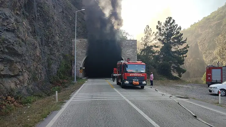 KARABÜK'te minibüse çarpmamak için manevra yapan çimento yüklü tanker tünelin duvarına çarparak alev aldı.