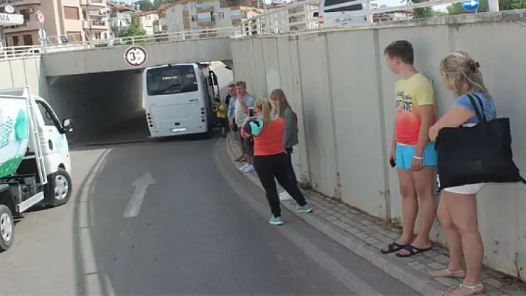 Edinilen bilgiye göre, Manavgat şehir merkezinden Şelale istikametine gitmekte olan Erkan Işılak’ın kullandığı 51 AAD 229 plakalı tur midibüsü, Çağlayan Mahallesi Zeynel Şenol Köprü girişinde bulunan 3 metre yüksekliğindeki alt geçitte sıkıştı.