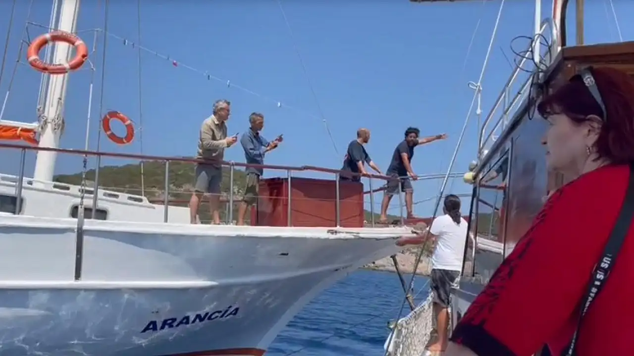 Muğla'nın Bodrum ilçesinde, koyda demirli tur teknesine başka bir tekne çarptığı, 1 turistin yaralandığı kaza cep telefonuyla görüntülendi.