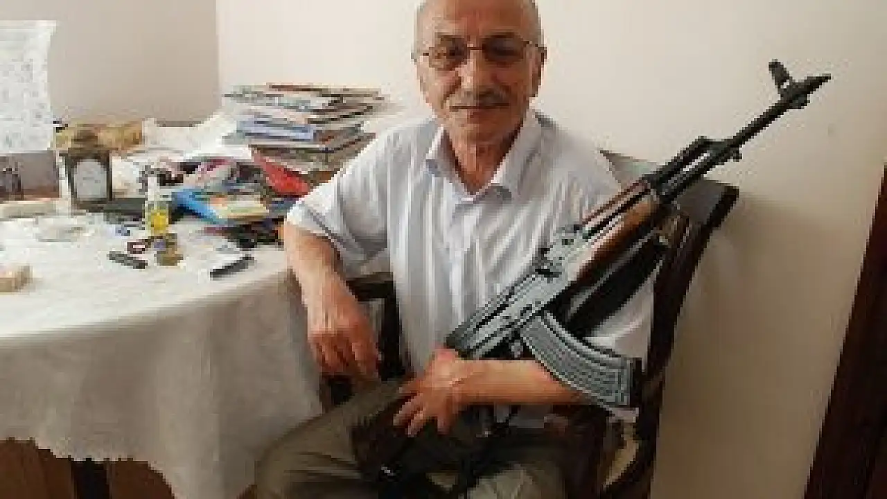 "1992-1993 Gürcistan-Abhazya Savaşı'nda elime aldığım ilk kalaşnikoftur bu. Enteresandır; hayatımda ilk kez kalaşnikof elime alıyorum. Cepheye giderken Kırmızı Köprü'de bir helikopter geldi. Herkes ateş ediyor. Ben de bunun nasıl çalıştığını bilmiyorum ama Türkiye'de askerlik yaptığım için şarjörünü takabildim. Helikoptere 6 el ateş ettim, isabet etti ama tabii zırhlı olduğu için düşmedi. Bütün savaş boyunca kullandım. Görevini yaptı işte, silahın görevi insan öldürmekse görevini yaptı.