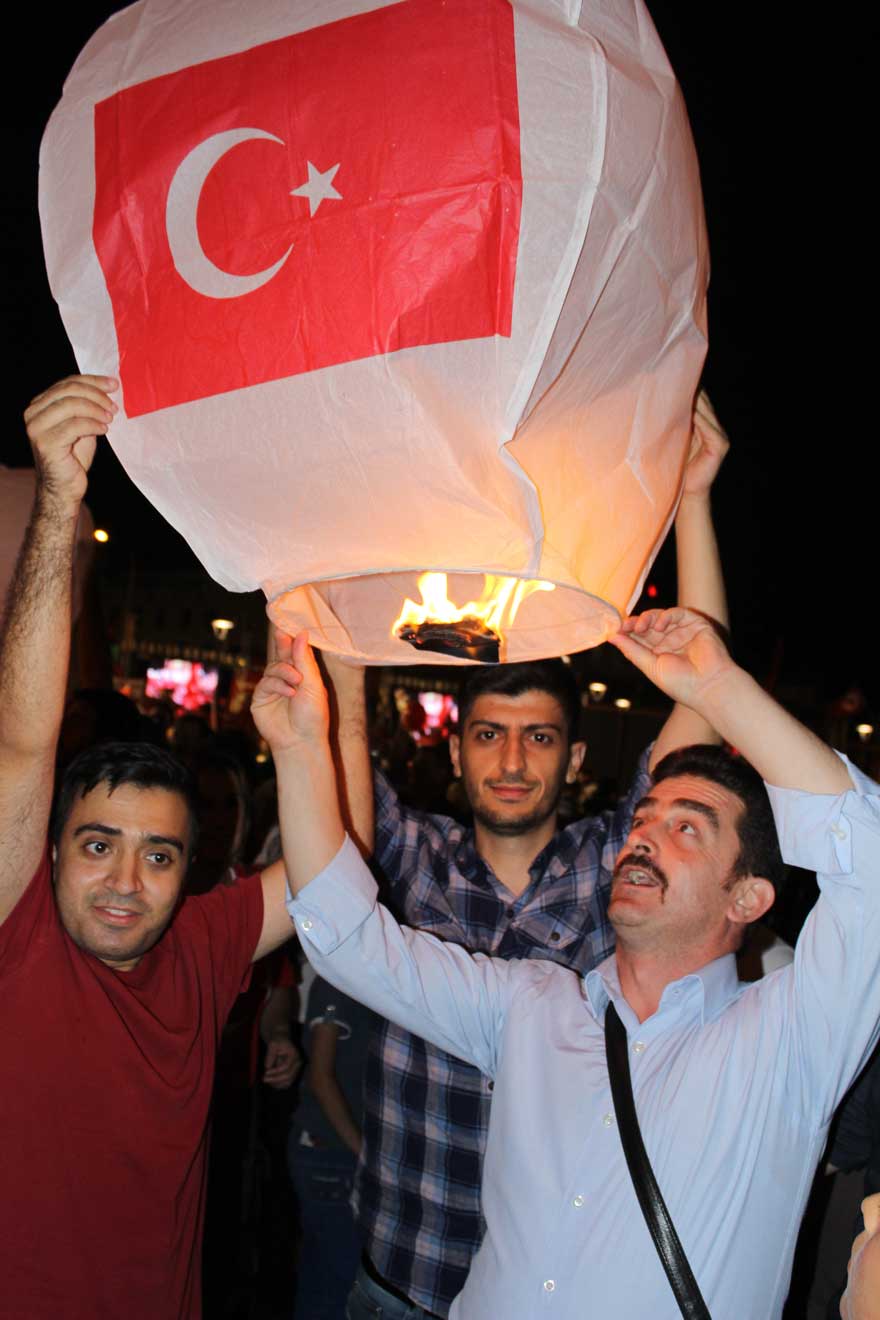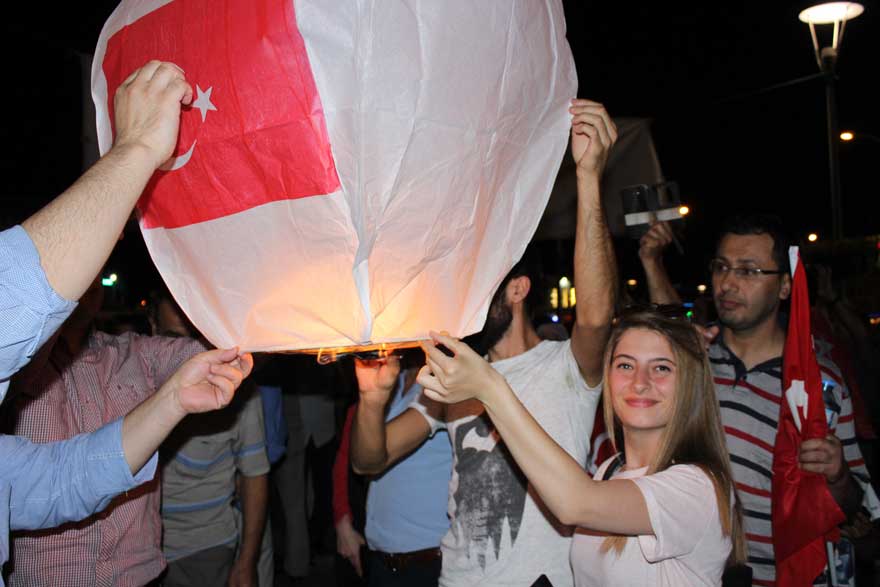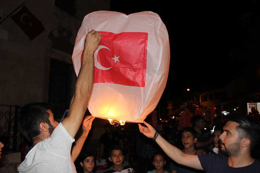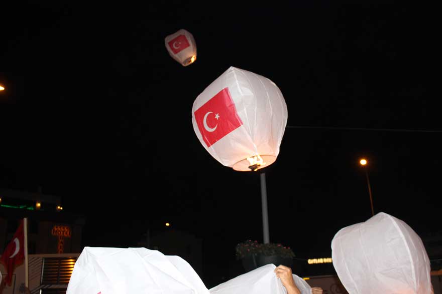 Memleket sevdalısı bir grup, fenerlerle gök yüzüne Türk bayrakları gönderdi. Dualar eşliğinde gökyüzüne salınan fenerleri vatandaşlar büyük bir dikkatle izledi.