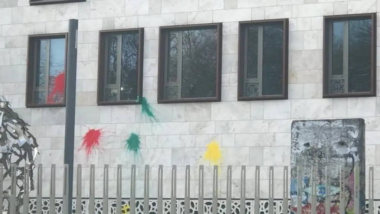 Başkent Berlin'in Tiergarten semtinde bulunan Türk Büyükelçiliği önüne gelen yüzleri maskeli dört saldırgan, önce sis bombası attı, ardından terör örgütü PKK'nın renklerini oluşturan kırmızı, sarı ve yeşil renkli boya torbaları atarak saldırıda bulundu.