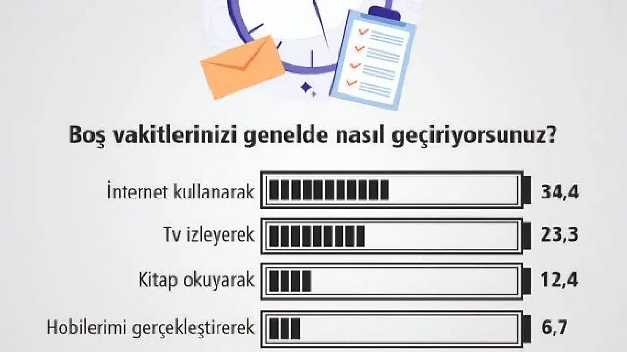 Araştırma şirketi Areda Survey, Türk halkına "Boş vakitlerinizi genelde nasıl geçiriyorsunuz?" sorusunu yöneltti. Katılımcıların yüzde 34,4'ü boş zamanlarını en çok internette geçirdiğini söyledi.