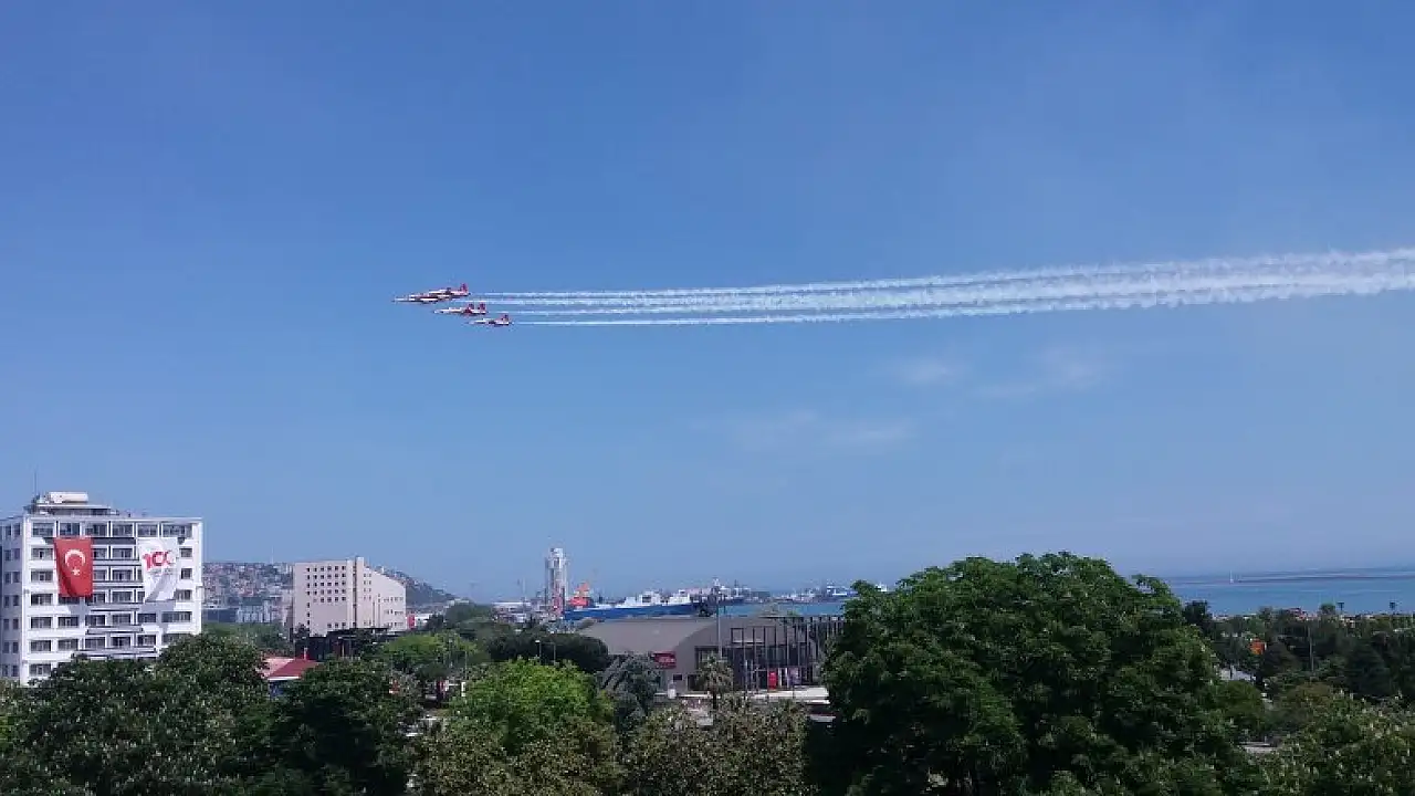 Milli Mücadele'nin 100. yılı kapsamında yapılan kutlamalara katılan Türk Yıldızları, dün hava muhalefetine rağmen nefes kesen bir gösteri yaptı. 10 binlerin sahillere akın ederek izlediği Türk Yıldızları, bugün Samsun’dan ayrıldı. Akrobasi timi ayrılırken şehrin semalarında kısa süren bir gösteri yaptı. Toplu halde uçan Türk Yıldızları, gökyüzünü tekrar şenlendirdi. Sonunda kalp çizen uçaklar, şehri selamlayarak Mevlana diyarı Konya’ya döndü.