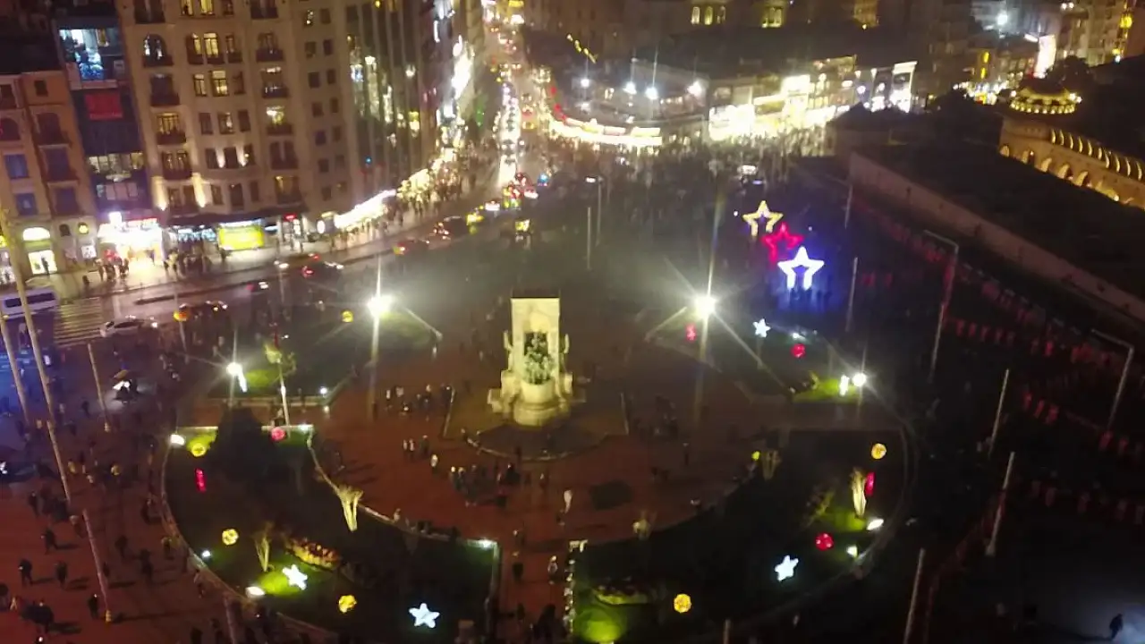 Yeni yıl kutlamalarının İstanbul'daki merkezlerinden bir tanesi olan Taksim'deki yoğunluk, havadan drone ile görüntülendi.