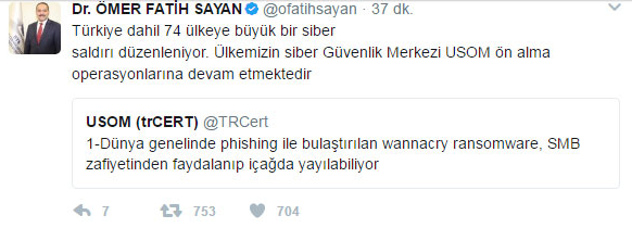 Sayan, "Türkiye dahil 74 ülkeye büyük bir siber saldırı düzenleniyor. Ülkemizin siber Güvenlik Merkezi USOM ön alma operasyonlarına devam etmektedir" ifadelerini kullandı.