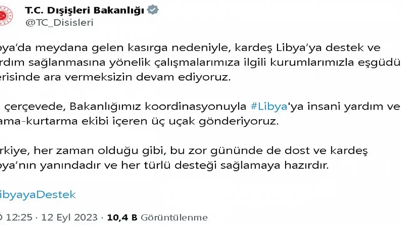 DIŞİŞLERİ Bakanlığı, Libya'da meydana gelen kasırga nedeniyle oluşan sel felaketine destek ve yardım sağlanması çalışmaları kapsamında, insani yardım ve arama-kurtarma ekibi içeren 3 uçak gönderileceğini açıkladı.