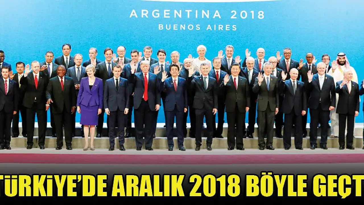 Türkiye, 2018 yılında çok önemli gelişmelere ev sahipliği yaptı. 15 Temmuz 2016 yılında meydana gelen hain darbe girişimi neticesinde ortaya çıkan gelişmeler, Türkiye’nin FETÖ, PKK, DAEŞ ve diğer değişik terörist örgütlerle mücadelesi 2018 yılının Aralık Ayı’nda da devam etti. - Türkiye Cumhurbaşkanı Recep Tayyip Erdoğan, Arjantin'in başkenti Buenos Aires'te yapılan G20 Liderler Zirvesi kapsamında Rusya Devlet Başkanı Vladimir Putin ve ABD Başkanı Donald Trump'la ayrı ayrı görüştü. - İçişleri Bakanlığı, delil veya kişisel veri niteliğindeki güvenlik kamerası görüntülerinin basın ve sosyal medyadan kamuoyuyla paylaşılmasının önüne geçmek amacıyla genelge yayımladı. - Cumhurbaşkanı Recep Tayyip Erdoğan, Arjantin’in başkenti Buenos Aires’te yapılan G20 Liderler Zirvesi boyunca Rusya, ABD ve Çin'in de aralarında bulunduğu 8 devlet ve hükümet başkanı ile görüşme gerçekleştirdi. - Erdoğan, G20 Liderler Zirvesi'nin düzenlendiği Costa Salguero Fuar Alanı'ndaki basın toplantısında, Suriye'nin kuzeyinde Türkiye’nin ve bölgenin güvenliğine tehdit oluşturan hiçbir yapıya izin vermeyeceklerini belirterek gazeteci Cemal Kaşıkçı cinayetine ilişkin "Veliaht Prens'in suç sabit olmadıkça kimseyi suçlayamayız" yaklaşımını kabullenmenin mümkün olmadığını vurguladı.