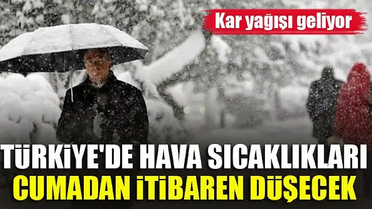 Balkanlar üzerinden cuma günü gelecek yağışlı sistemin etkisiyle Türkiye'de sıcaklıkların hafta sonunda kuzey, iç ve batı kesimlerde 6 ila 15 derece azalması, pazar günü kuzey ve iç bölgelerin tamamının kar yağışının etkisi altına girmesi bekleniyor.