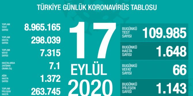 Sağlık Bakanı Fahrettin Koca, paylaşımında, "Toplamda 9 milyona yakın test yapıldı. Bugün 1648 yeni hastamız var. Kayıplarımızı ve ağır hasta sayısında artışı durdurmak elimizde." ifadelerini kullandı.