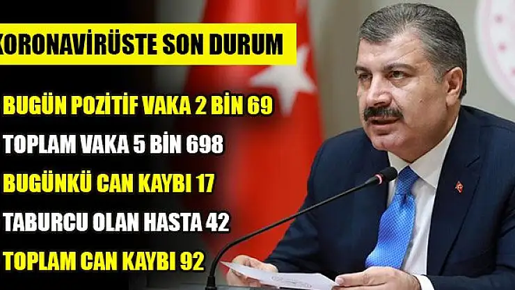 Sağlık Bakanı Koca, 'Son 24 saatte 2 bin 69 pozitif vaka tespit ettik. Toplam vaka sayımız 5 bin 698. Bugün kaybettiğimiz 17 kişiyle can kaybımız 92'yi buldu.' dedi.