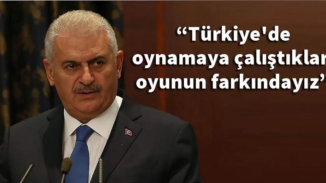 Başbakan Yıldırım, 'Nasıl Suriye'de Irak'ta bir ulusu, bir ülkeyi yok etmeye çalışıyorlarsa Türkiye'de de aynı oyunu oynamaya çalışıyorlar. Bu oyunun farkındayız.' dedi