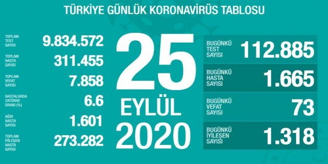 Türkiye'de son 24 saatte 1665 kişiye Kovid-19 tanısı konuldu, 73 kişi yaşamını yitirdi.
