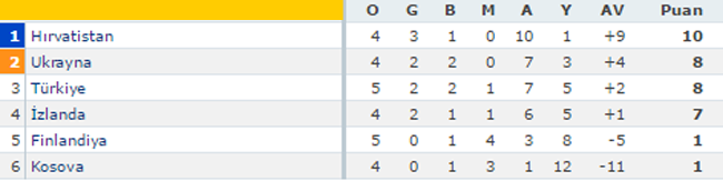 I Grubu'nda bir maç eksiği olan Hırvatistan 10 puanla ilk sırada yer alıyor. Bu akşam Hırvatistan deplasmanına çıkacak olan Ukrayna, 8 puanla 2. sırada. Bir maç eksiği olan İzlanda, Türkiye'nin ardından 7 puanla 4. sırada yer alıyor. Türkiye'ye 2-0 yenilen Finlandiya 1 puanla 5. sırada yer alıyor.