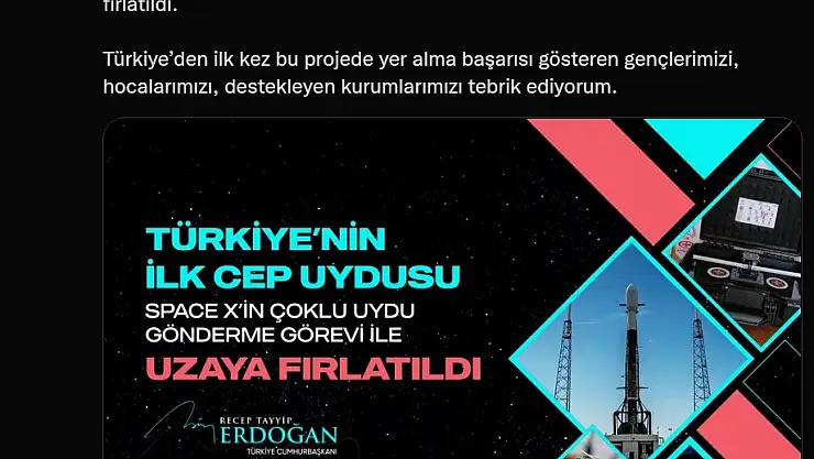 "2019 TEKNOFEST yarışması model uydu alanında 1'inci olan gençlerimizin geliştirdikleri Grizu-263A mini uydu, bugün SpaceX tarafından uzaya fırlatıldı. Türkiye'den ilk kez bu projede yer alma başarısı gösteren gençlerimizi, hocalarımızı, destekleyen kurumlarımızı tebrik ediyorum"