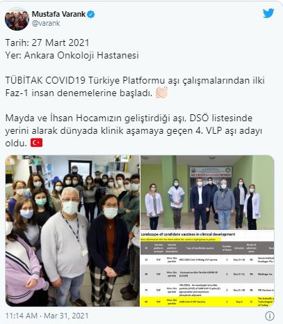 Varank, sosyal medya mesajında fotoğrafların yanı sıra "Tarih: 27 Mart 2021, Yer: Ankara Onkoloji Hastanesi. TÜBİTAK COVID-19 Türkiye Platformu aşı çalışmalarından ilki Faz-1 insan denemelerine başladı. Mayda ve İhsan Hocamızın geliştirdiği aşı, DSÖ listesinde yerini alarak dünyada klinik aşamaya geçen 4. VLP aşı adayı oldu." ifadelerine yer verdi.