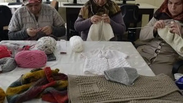 Ücretsiz dağıtılan yün ipliklerden alan Safranbolu Kültür Eğitim Merkezi kursiyerleri ile ev hanımları, Türkmen çocukları için kazak, atkı, hırka, şapka ve eldiven örüyor.