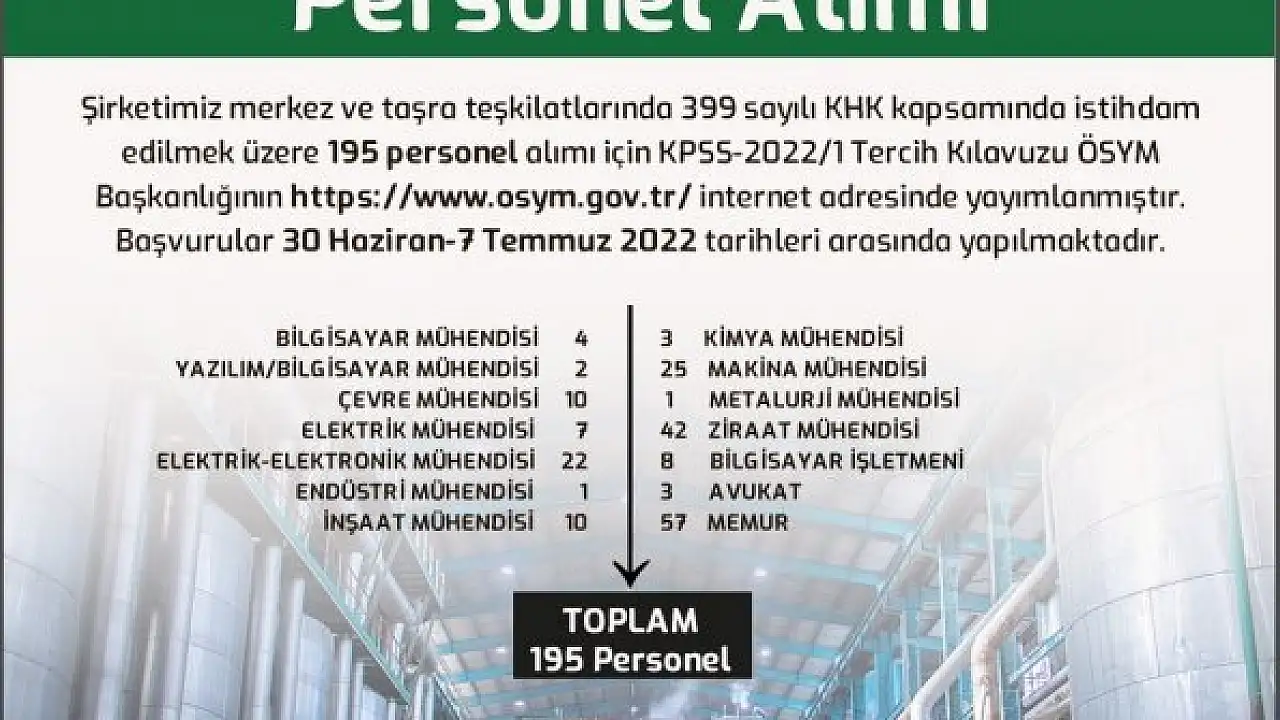 Duyuru Türkşeker A.Ş'nin sosyal medya hesabından yapıldı. KPSS-2022/1 Tercih Kılavuzu'nun ÖSYM Başkanlığının https://osym.gov.tr internet adresinde yayımlandığı belirtilen açıklamada, 399 sayılı KHK çerçevesinde yapılacak alım için başvuruların 30 Haziran-7 Temmuz tarihleri arasında yapılacağı kaydedildi. Türkşeker tarafından alınacak 195 personelin dağılımı şöyle: