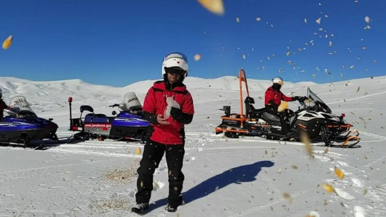 Cinq membres du commandement de l’équipe de recherche et de sauvetage de la Gendarmerie (JAK) se sont rendus dans les zones difficiles d’accès avec une motoneige et ont laissé 14 mottes de trèfle sec, 90 kilogrammes de fourrage et 150 pains.