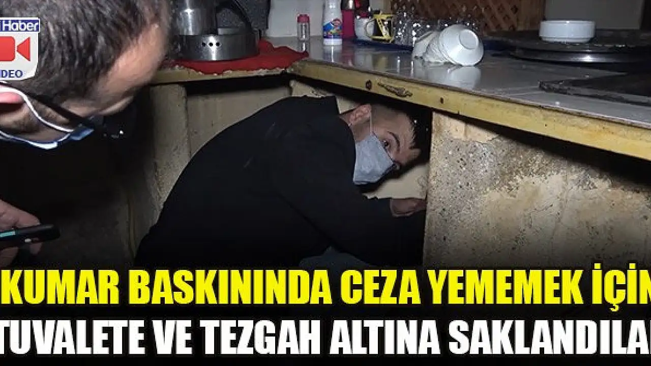 Ruhsatsız bir kıraathaneye 'kumar' baskını yapan polis, ceza yememek için saklanan 2 kişiyi tuvalette, 2 kişiyi de tezgah altında yakaladı. Kıraathane ve oto tamirci dükkanında 'kumar' oynayan 17 kişiye toplamda 106 bin 250 lira idari para cezası uygulandı.