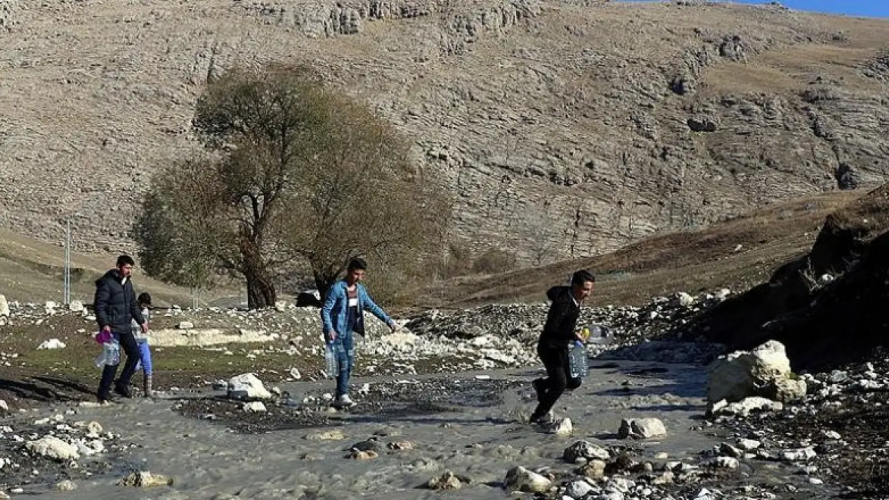 Kaynağa ellerinde kova ve bidonlarla yorucu bir yolculuk sonrası ulaşan köy sakinleri, buradan aldıkları tuzlu suyu hafta boyunca kullanıyor.